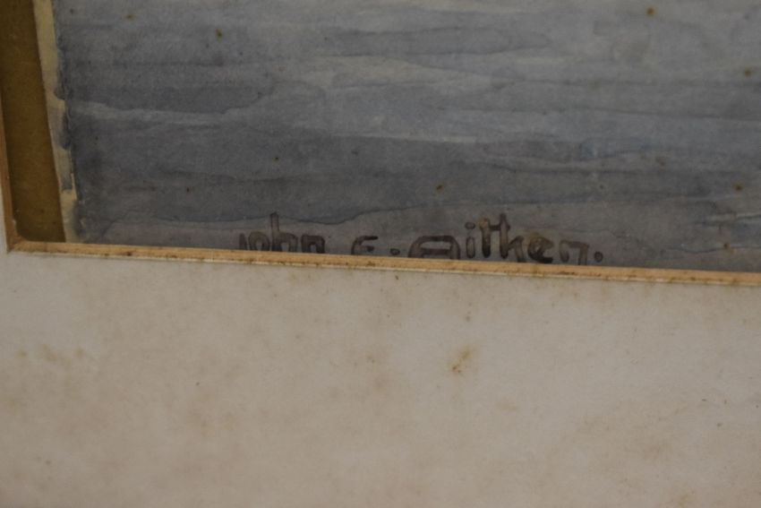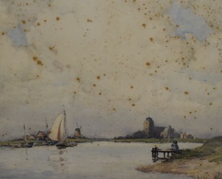 John Ernest Aitken (British 1881-1957) watercolour, Dutch waterway with boats, windmills and church in the distance, signed lower left, within a card mount and moulded frame, under glass 36cm x 44cm & 50cm x 57cm overall, heavily foxed, slipped within mount.