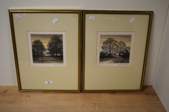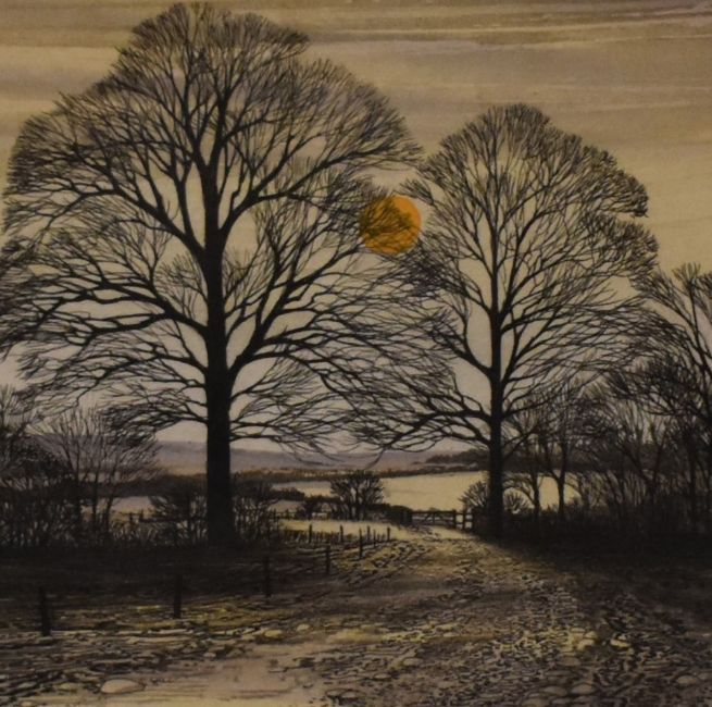 After Kathleen Caddick (British b.1937) artists proof, winter landscape with setting sun, signed in pencil to margin, within a broad card mount and slender moulded gilt frame, under glass 18cm x 18cm & 41cm x 32.5cm overall. Sold along with another similar artists proof from the same artist, slightly differing landscape.