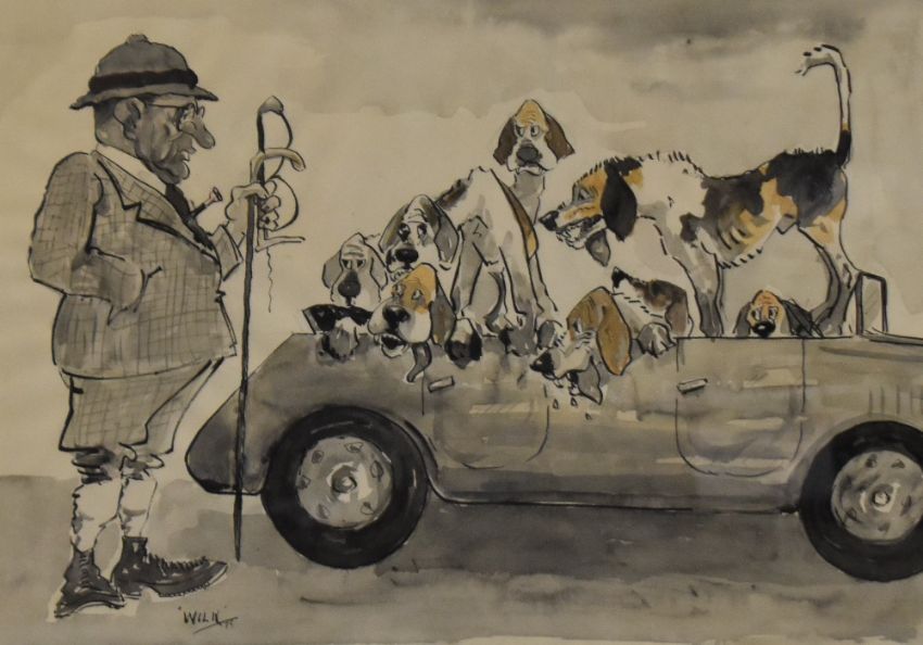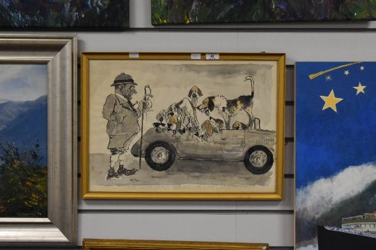 Local Interest* 'WILK' John William (Bill) Wilkinson (British 1906-1994) an amusing ink and watercolour cartoon depicting George Graham and his hounds, entitled 'Its Nowte Gitten Them In - Its Gitten Oot!' within a slender moulded gilt frame, under glass 36cm x 51cm & 40cm x 55cm overall.