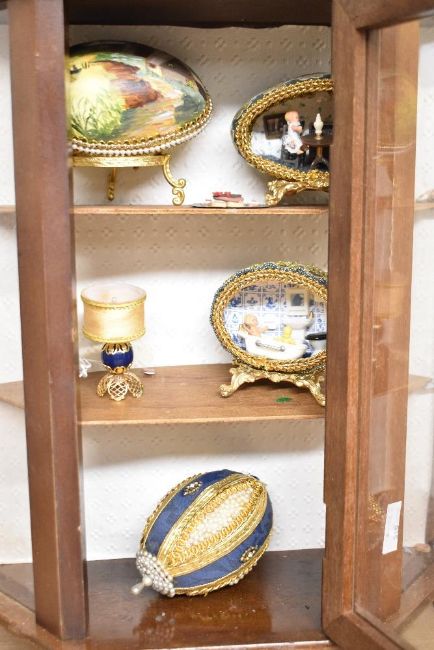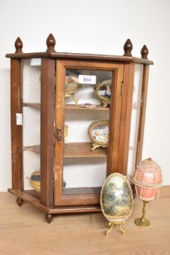 A small wooden display cabinet 37cm x 40cm having three glazed panels and two shelves sold with six decorted eggs