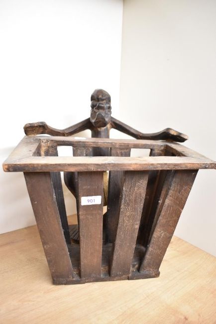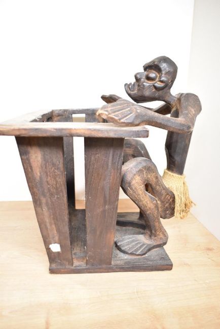 An unusual carved wooden tribal souvenier newspaper rack having Papua New Guinea figure, h38cm