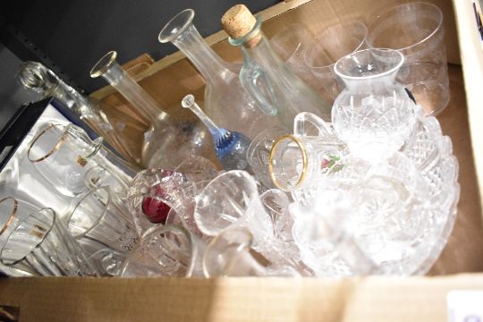 A cased pair of Bohemia Crystal glasses having bronzed stem and rim and a selection of glass items including decanters, baskets and glasses etc