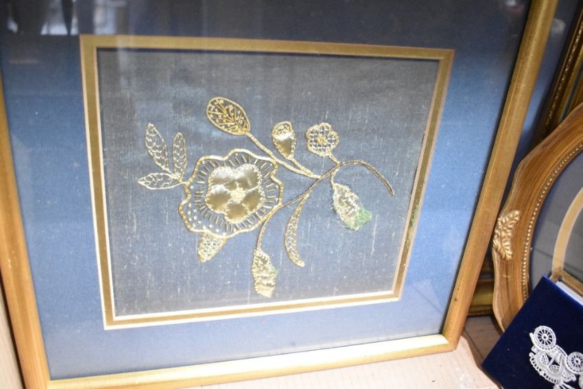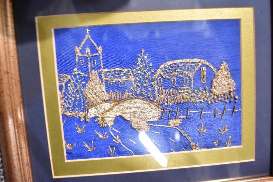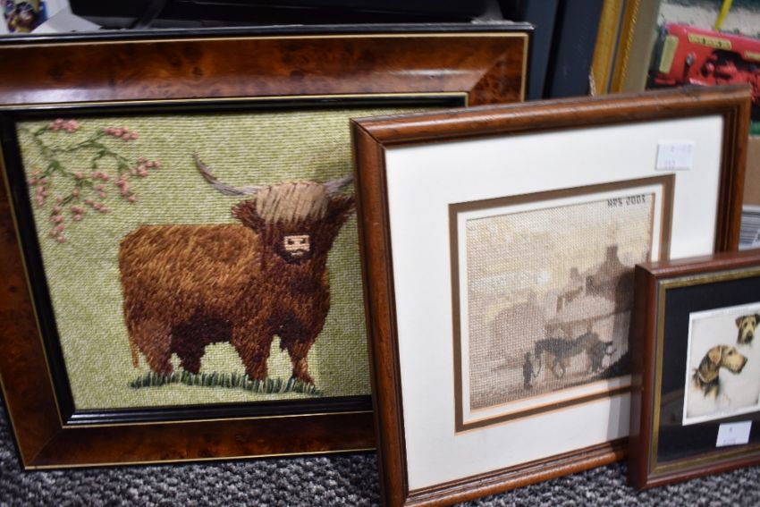 A carton of assorted embroidered and decoupage pictures