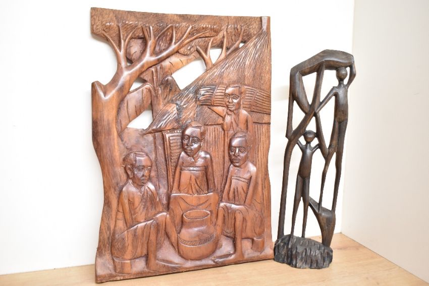 A hand carved African themed wooden wall plaque sold along with a similar themed carved abstract family of three