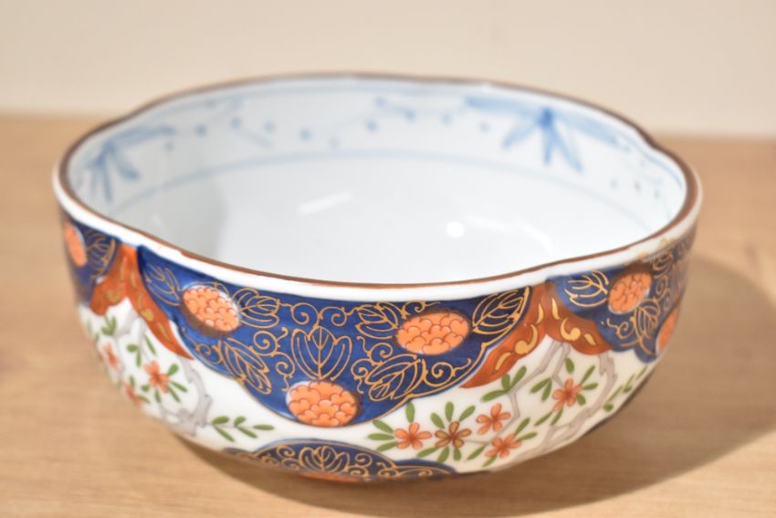 A decorative Japanese Imari porcelain bowl, of lobed circular form and decorated in the typical manner, signed to base within a broad textured red band 18cm