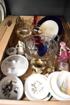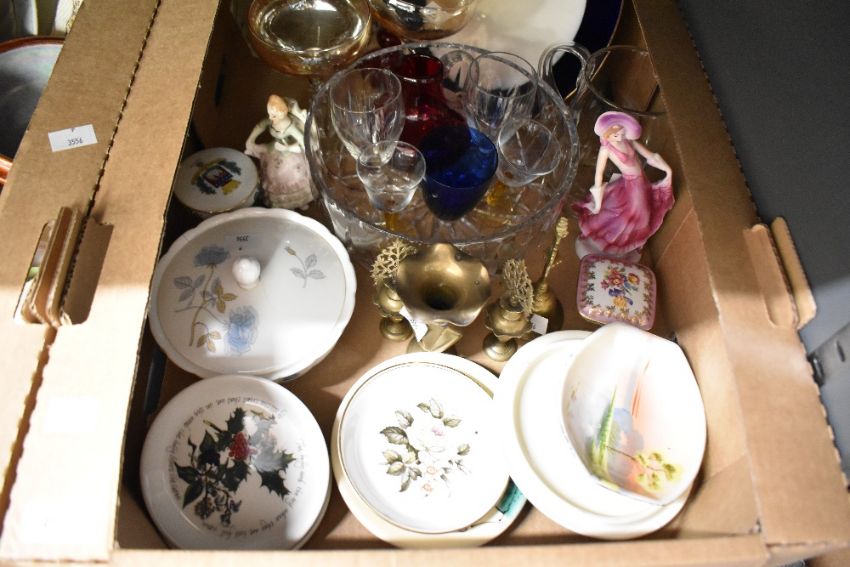 A cut glass dessert bowl, a pressed glass water jug, a pair of amber lustre twisted stem Champagne glasses, a Wedgwood 'Ice Rose' trinket bowl and a Portmeirion 'The Holly and The Ivy' trinket dish etc