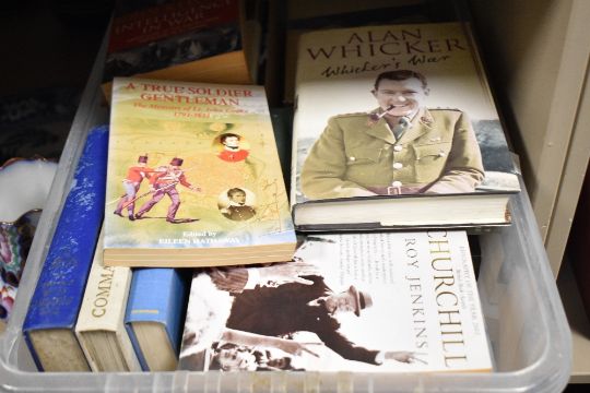 Two boxes containing various military warfare books, to include Intelligence in War by John Keegan, Castle Commando by Donald Gilchrist, The Zulu War, 1879 by James W Bancroft, A True Soldier Gentleman by Eileen Hathaway ect