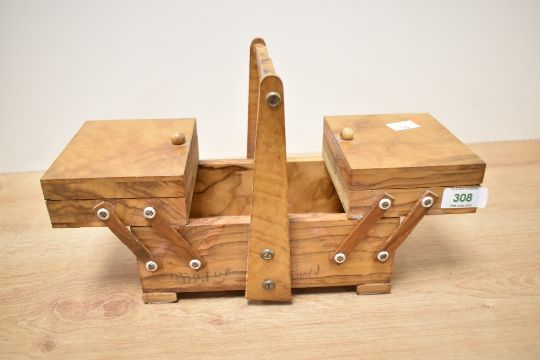 A mid 20th century olive wood concertina sewing box, of small proportions with central carrying handle 18.5cm x 20cm