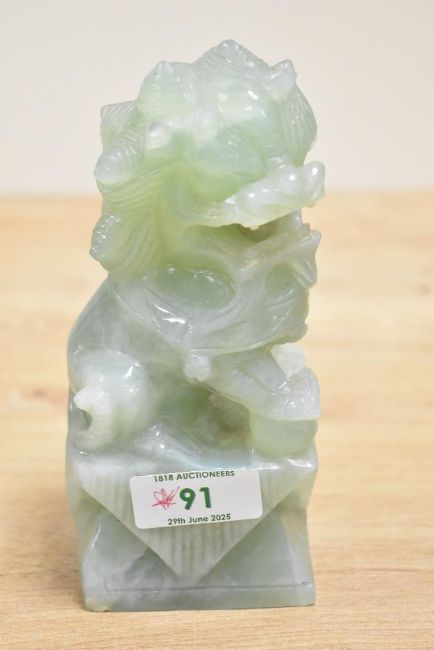 A Chinese carved green stone Dog of Foe, modelled with mouth gaping and front paw resting on a ball, 15.5cm