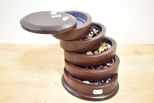 A wooden jewellery box, of oval form with sliding levels, containing a small collection of costume jewellery