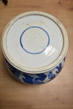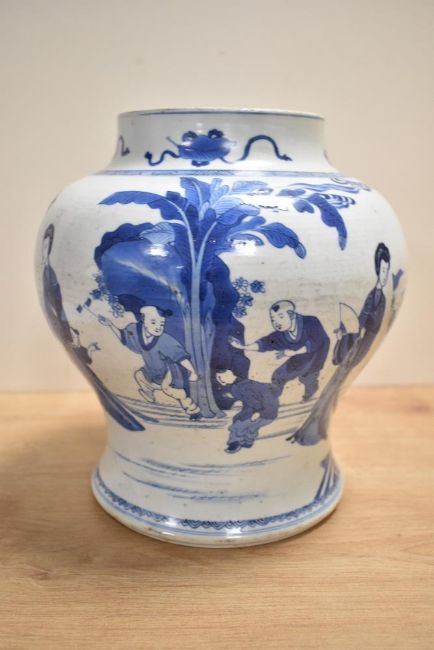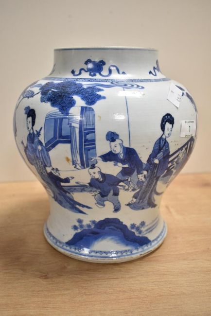A blue and white Chinese vase of baluster form, decorated with figures within a landscape scene, circular mark to base, vase h24cm, overall h25cm