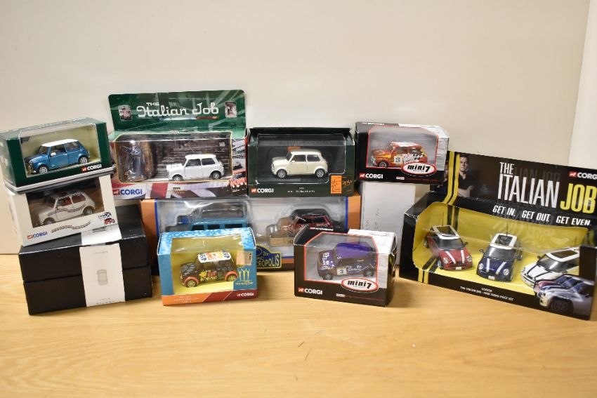 Corgi Die-casts, Mini's, CC99138 The Italian Job 3-Car Set, 04441 The Italian Job, CC99153 Mini Cooper & Land Rover/Trailer, G50031 Austin Mini, 04503 Old English White, CC86508 2002 Collectors Club, CC82202 & CC82226 Mini 7 Racing Club, CC82235 Mini 40, CP82223 Caledonian, CC82222 Manchester 2002 and CP82230 Mini in the Park, all boxed, all appear unused (15)