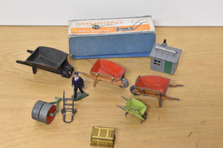 Dinky Supertoys Die-cast, 751 Lawn Mower in original box with paper label along with silmilar Accessories and Railway Station Figure and Accessories