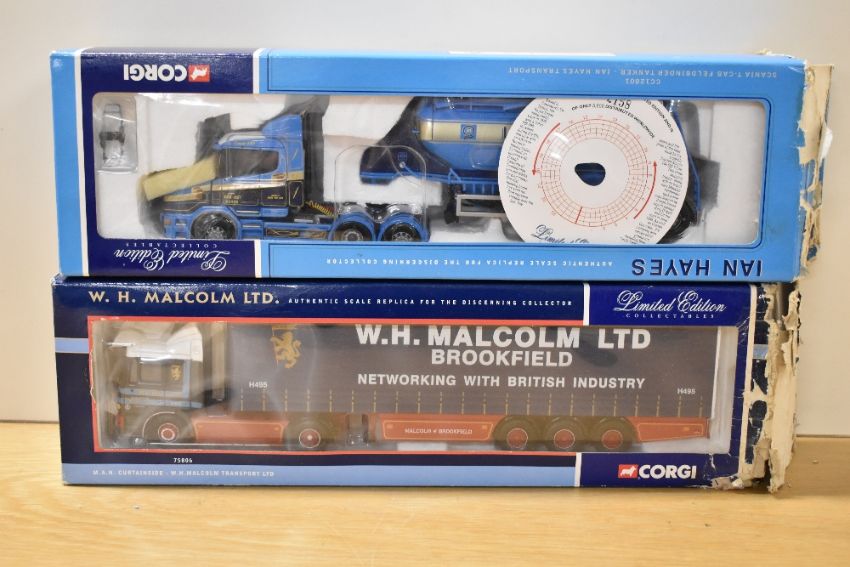 Two Corgi 1:50 scale Limited Edition Diecast, CC12801 Scania T-Cab Feldbinder Tanker- Ian Hayes Transport and 75806 MAN Curtainside W.H Malcolm Ltd, all mirrors unattached and present, both certificates present, both appear unused, both boxes have damp damage