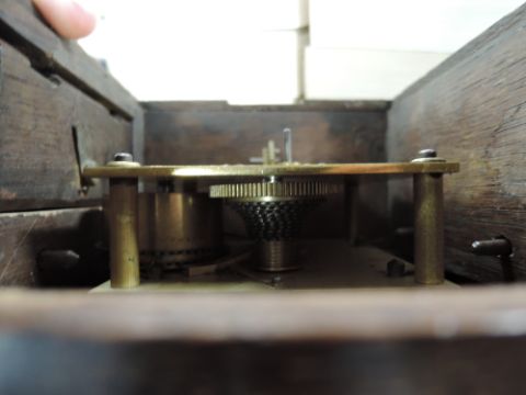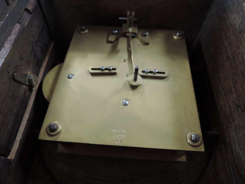 London & North Western Railway Keswick Station 8 inch mahogany cased Fusee Railway Clock having roman numeral dial with spade hour hand, movement stamped W&H SCH 18, case with one side door and a bottom door both secured by a brass turn, pendulum present, winding key present, back of case marked L&N.W.RY Keswick, later LMS Badge added, not tested for working orde but believed to be workingr, damage to dial seen