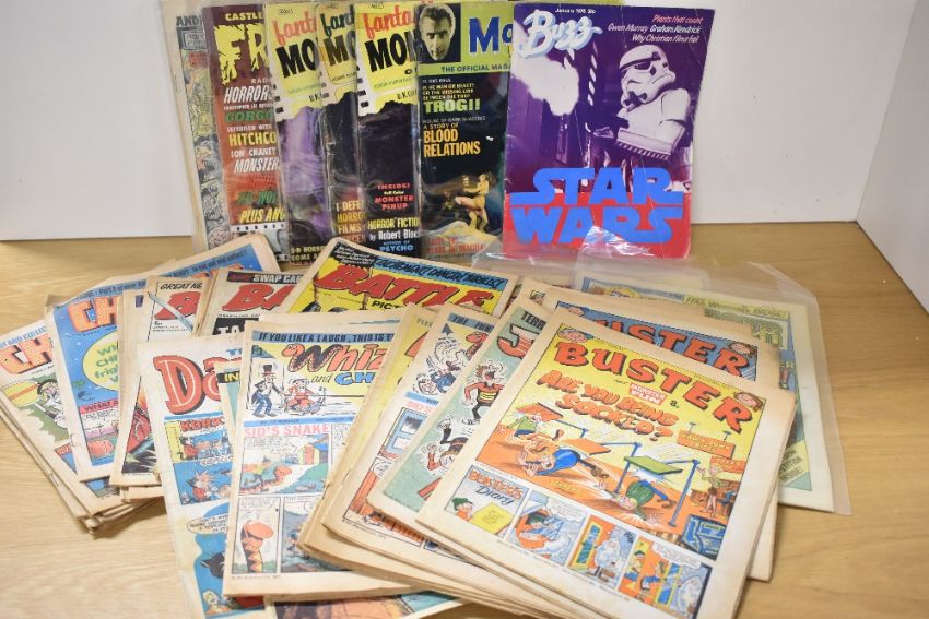 1970's and later Comics, Cheeky x5, Battle x9, Dandy x4, Fury x1, Cracker x1, Whizzer and Chips x4, Jackpot x1, Whoopee x1, Krazy x1, Buster x8, Beano x1, Buzz Star Wars x1, 1980's Eagle x1, Eagle and Tiger with badge x1, 2000AD x2, Castle of Frankenstein x1, Fantastic Monsters of the Films x3, For Monsters Only x1 (46)