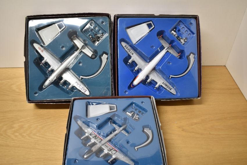 Three Corgi Classics 1:144 scale Aviation Archive 1st Issue Die-casts, 47401 Avro Lancaster MK X-PP, 47505 Lockhead Constellation Braniff International Airways and 47507 Lockhead Constellation Eastern Airlines, all in original boxes
