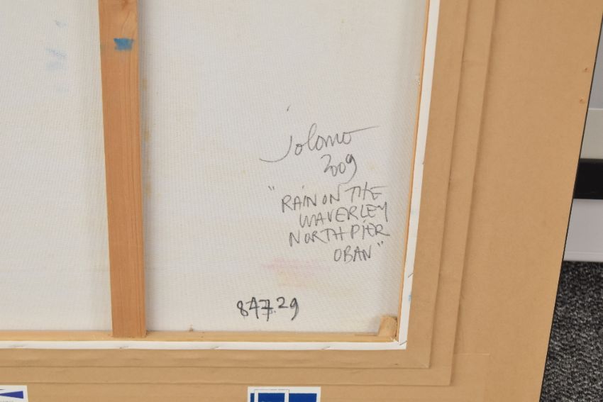 John Lowrie Morrison (Jolomo) (Scottish b.1948) oil on canvas 'Rain on The Waverley, North Pier, Oban' signed lower right, counter signed, dated 2009 and entitled verso, within a material covered slip and moulded silver coloured frame, under glass 60cm x 59cm & 86.5cm x 86cm overall.