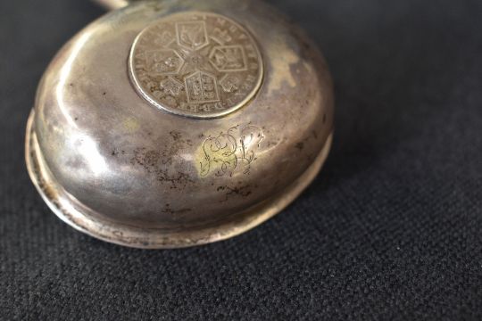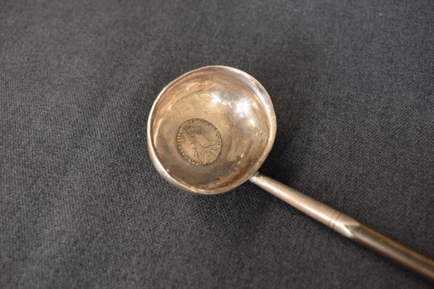 A George III white metal and baleen toddy ladle, of traditional form with baleen handle and coin inset to the bowl, dated 1787, approximately 42cm