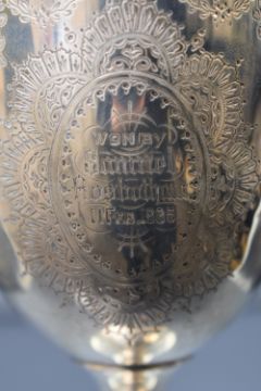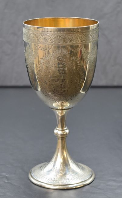 A Victorian silver presentation goblet, of traditional form having gilt interior with decorative floral swags engraved with two oval cartouches having personalised engravings, raised on a knopped stem and circular moulded foot with further engraving, marks for London 1882, maker Walter & John Barnard, 19cm, 208g