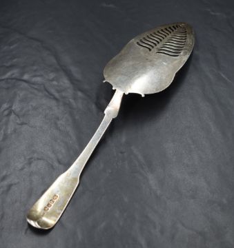 A George III silver fiddle pattern fish slice, having pierced decoration and floral engraving, marks for London 1803, maker George Ewings (probably), 28.5cm, 104g
