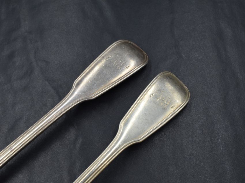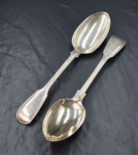 A pair of Victorian silver fiddle and thread pattern serving spoons, having rubbed monograms to terminals, marks for London 1864, maker Chawner & Co, 186g gross
