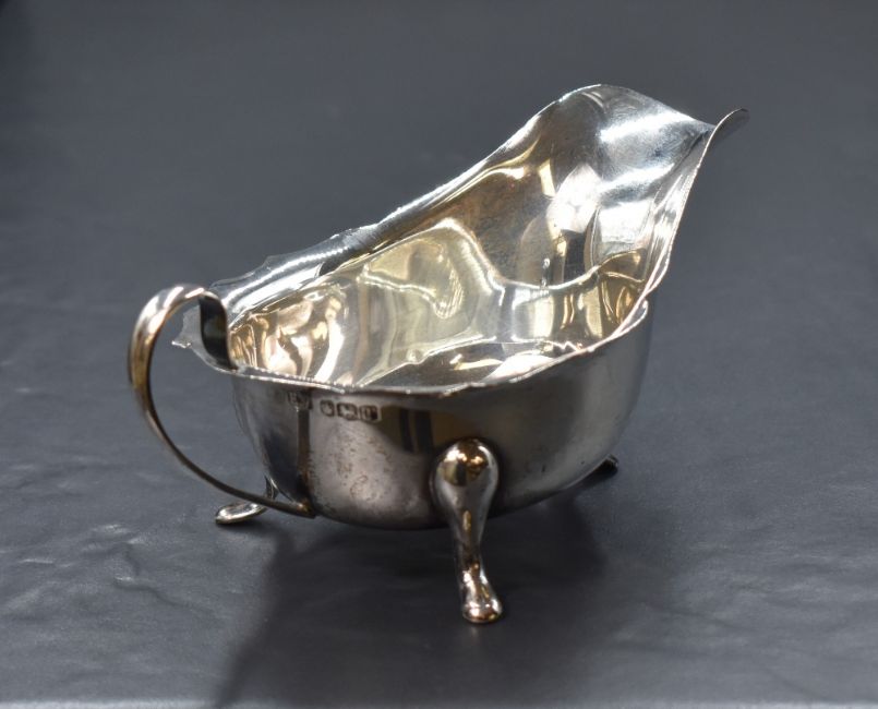 An Elizabeth II silver sauce boat, having a Chippendale style rim and generous spout opposed by a c-curve handle, raised on three cabriole style legs marks for Sheffield 1961, maker Viner's Ltd, 108g