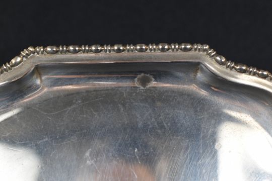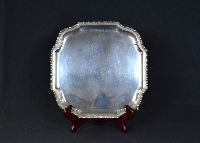 An early George V silver salver, of square form having an egg and dart rim, raised on four hoof style legs, marks for London 1913, maker Hawksworth, Eyre & Co Ltd, 22.5cm, 485g