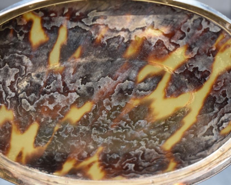 An early George V silver and tortoiseshell trinket box, the silver oval box having a tortoiseshell lid with decorative rim, silver inlay and lined interior, raised on four cabriole style legs, marks for Birmingham 1918, maker Deakin & Francis Ltd, 12.5cm x 9cm, 231g. Interior is loose