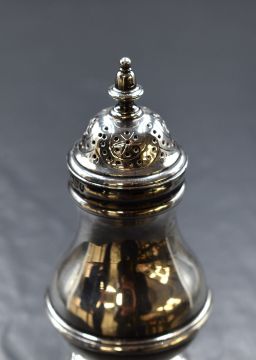 A Victorian silver sugar caster, the finial top of a circular bulbous body having step moulded decoration, raised on a circular step moulded foot, marks for London 1897, maker Charles Stuart Harris, 78g