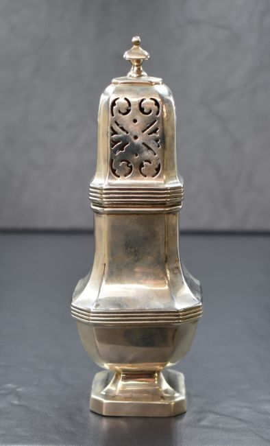 A George V silver sugar caster, having a pierced, finial topped cover over the square canted body, raised on a square step moulded foot, rubbed marks for Sheffield 1932, John Sanderson, 18cm, 166g