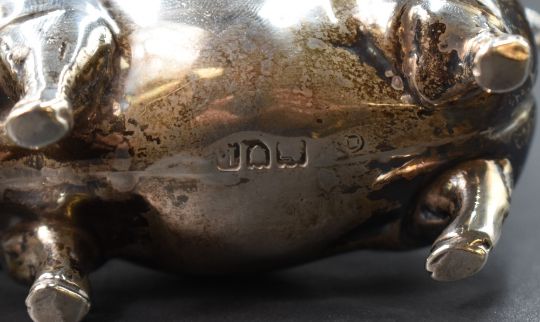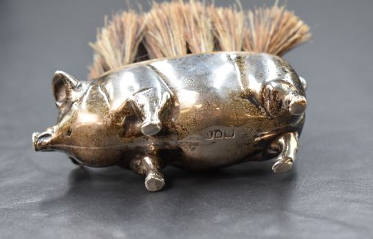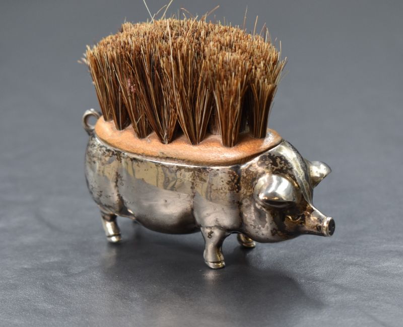 An Edwardian silver novelty pen wipe, modelled as a pig, having bristles to the back, marks for London 1905, rubbed makers mark, 8.5cm, 90g
