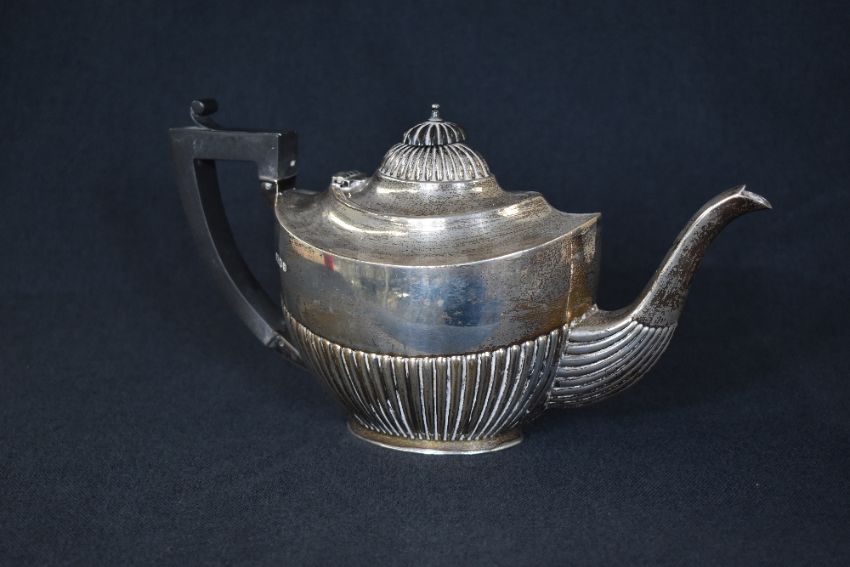 An early George VI silver tea pot, of oval form having a half gadrooned body, raised on an oval foot, marks for London 1937, maker Robert Pringle & Sons, 531g