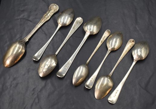 A group of eight silver Old English and Queen's pattern teaspoons, marks to include London, Sheffield, Newcastle, 1810, 1820, 1847, makers Thomas Wallis (II) & Jonathan Hayne, John Batt, 120g gross