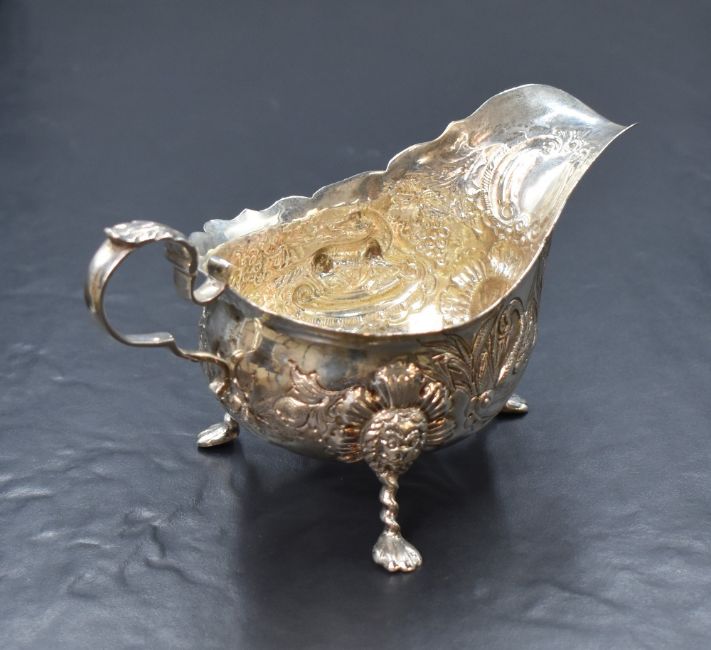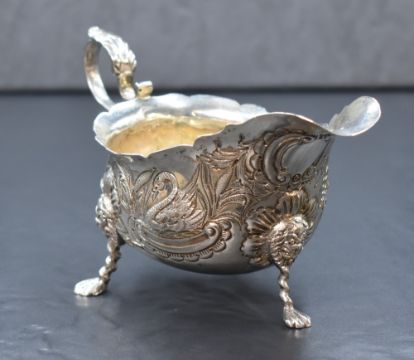 An Irish George V silver sauce boat, of traditional form having Chippendale style rim, scroll handle opposed by a narrow spout, with embossed decoration of a swan and fox and scroll work, raised on three claw style legs with lion heads, marks for Dublin 1933, maker Charles Lambe, 163g