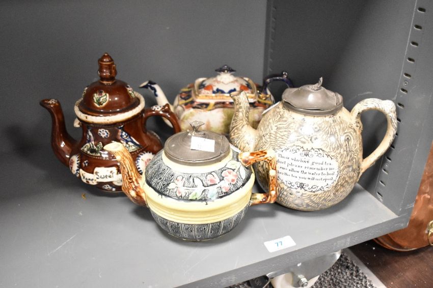 A S.H. Sons 'Dorothy' pattern tea pot having gilt edging and decorated with floral designs, L24cm, sold together with 3 other tea pots, (4)