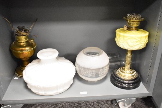 A 19th century oil lamp having embossed yellow glass body with double burners and raised on a brass column, h41cm, sold together with a two glass shades, a brass oil lamp and two glass chimneys, (6)