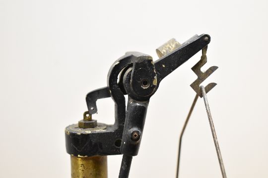 An early/mid 20th century Griffin & George Ltd scientific quadrant paper balance scale having a cylindrical brass body and black cast iron base, impressed mark 'Made in Britain', pattern no '697961', h35cm, sold together with an industrial enamel ceiling shade, two marine salvage pulleys, a ships clinometer and a pair of Art Nouveau vases ect, (15)