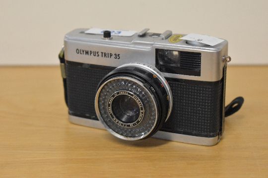 An Olympus Trip 35 35mm film camera, with a built in Olympus D Zuiko 40mm f2.8 lens.