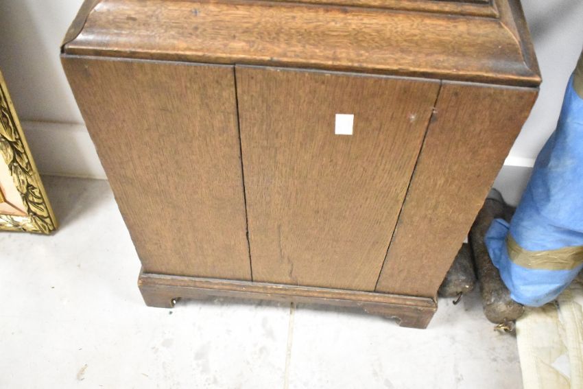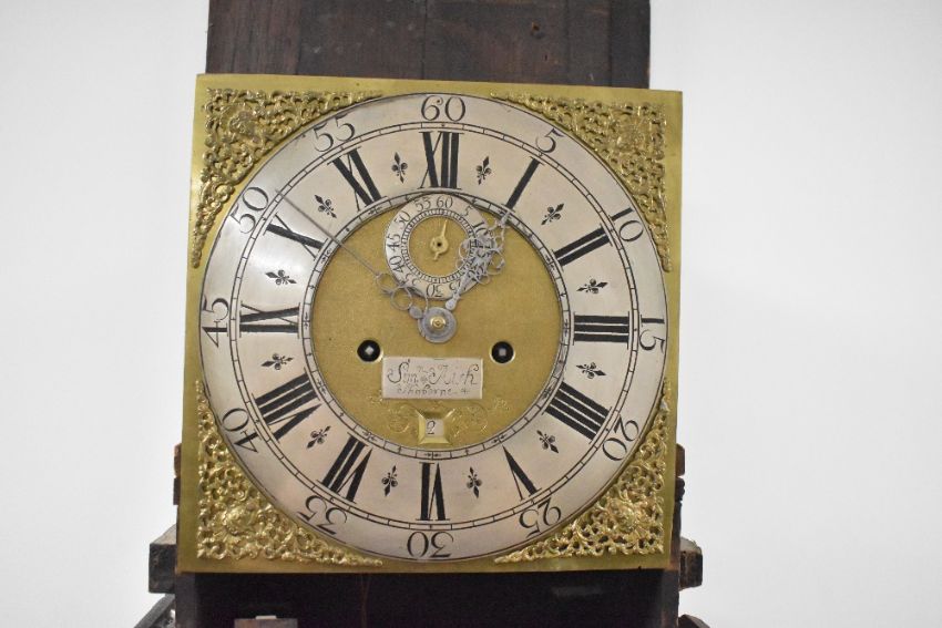 An 18th Century oak long cased clock having eight day movement having square hood and column supports, with brass and silvered dial, named for Sim Aish, Sherborne Complete with pendulum and weights