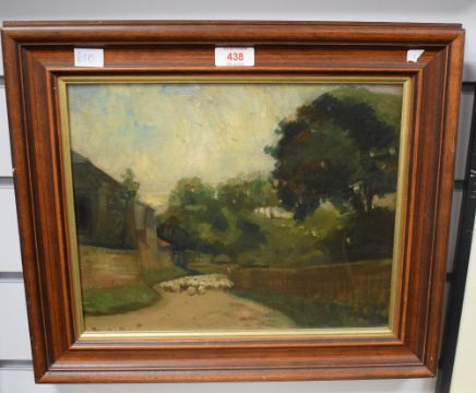 William George Robb (British 1850-1935) impressionist oil on panel, a figure droving sheep, initialled lower left, within a later moulded frame, 25cm x 32cm & 37cm x 43.5cm overall