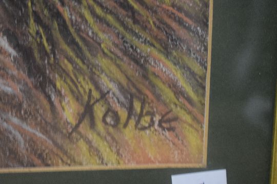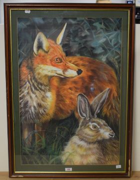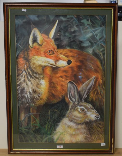 Kolbe (20th century) watercolour a large and striking depiction of a fox and Hare amongst grass and foliage signed lower right within a green card mount and moulded frame under glass 76cm x 52cm & 90cm x 64cm overall. Some losses to frame.