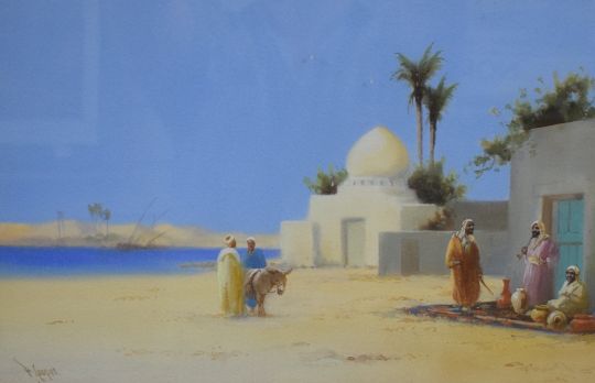 Reginald Cooper (British 20th century) a pair of Middle Eastern/Egyptian scene watercolours, fruit vendors, signed lower left and right, withinb a broad gilt card mounts and moulded gilt frames under glass 24.5cm x 37.5cm & 47cm x 66cm overall.