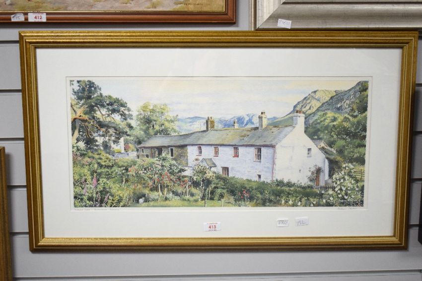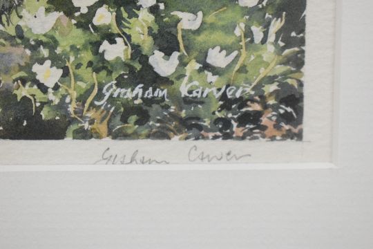 Local interest* After Graham Carver (British contemporary) decorative watercolour ' Evening Light'-Buttermere Cumbria, counter-signed and entitled in pencil to margin, within a card mount and moulded gilt frame, under glass 28cm x 62cm & 45cm x 80cm overall.