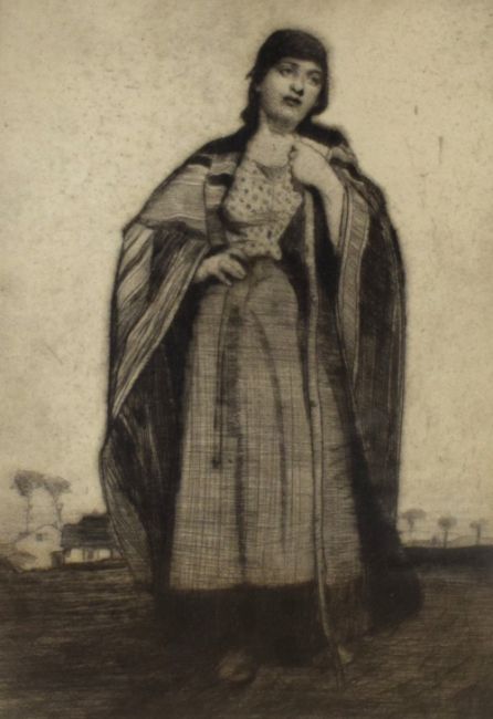 After William Lee Hankey (British 1869-1952) monochrome etching, robust country woman with hazel stick, signed in pencil to margin along with artists blindstamp, within a cream card mount and slender ebonised frame, under glass 26cm x 18.5cm & 42.5cm x 32.5cm overall.