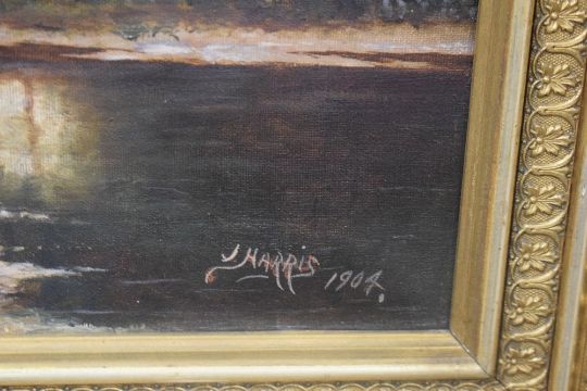 J Harris (British 19th/20th century) oil on canvas, river scene within a lakeland landscape, signed and dated 1904 lower right, within an acordn and oak leaf moulded gilt frame, 39cm x 60cm & 58.5cm x 79cm overall. Canvas backed with brown paper. The canvas appears to have been repaired and over painted in two places hand has a small patch of damage lower centre.