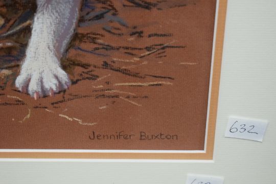 Jennifer Buxton (British 20th/21st century) coloured pastels on paper, portrait of a Jack Russell Terrier, signed lower right, within a stepped card mount and moudled frame, under glass 36cm x 27.5cm & 54.5cm x 45cm overall.