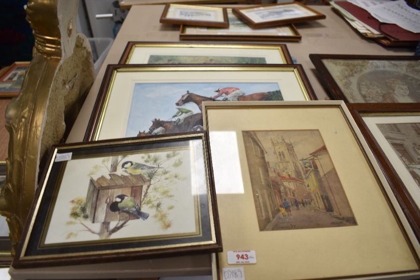 Two watercolours entitled 'Over the Sticks' and 'Riding to Hounds' after Ron Lewin both mounted framed and glazed measuring 45cm x 35cm sold together with a watercolour depicting Cromer and a print of birds.
