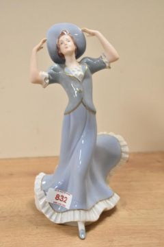 An Art Deco style Czechoslovakian Royal Dux porcelain figurien of a female wearing blue dress and hat, h24cm