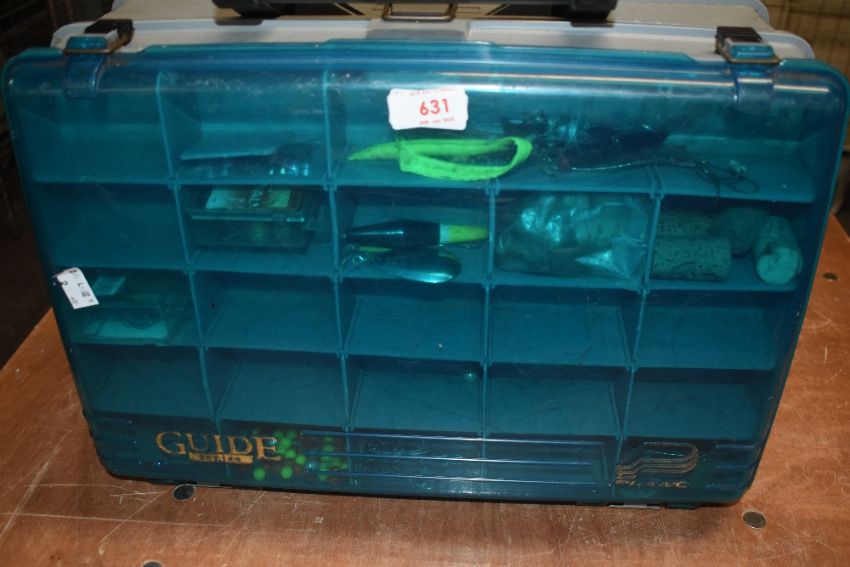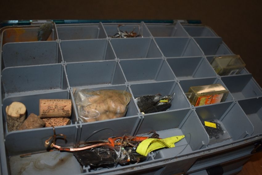 A fishing tackle box containing weights, lures, rigs etc
